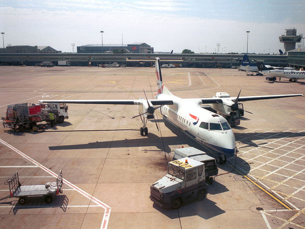 | Sitting on Stand 41 prior to the "not flying" to GLA as BA 1641. Note the "sunroof" open in the cockpit and the fuel connection to the rear of the left engine. See the trip report for further details. |