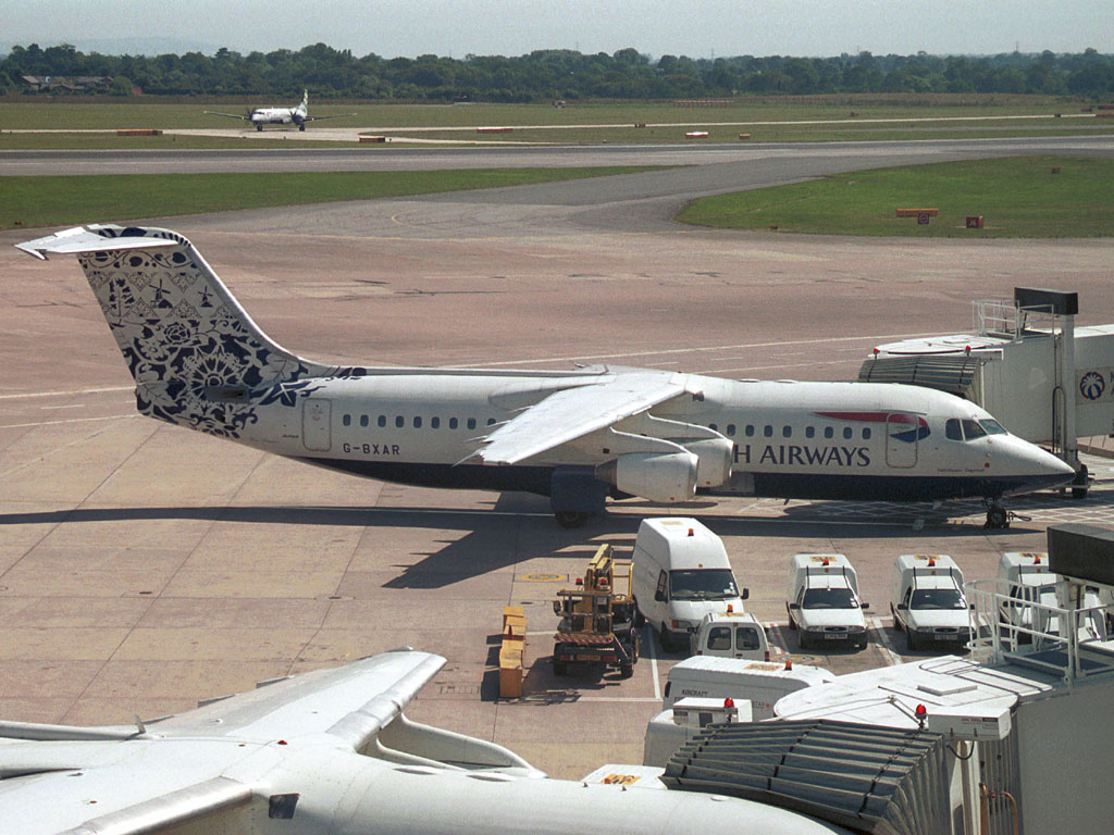 G-BXAR parked at Stand 48 at MAN. BA Citiexpress ATP G-MAUD taxiing in from a landing on 06R in the background and the wings of BA Citiexpress RJ100 G-BZAY in the foreground. |