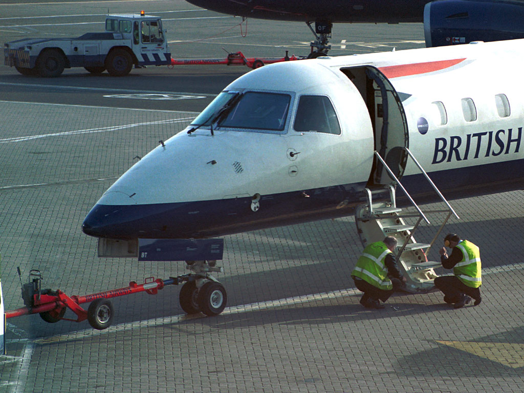 Due to a fault with the door mechanism, G-EMBT being worked on by engineers. (See the trip report for further information). G-EUOF being pushed back from stand 19 in the background. |