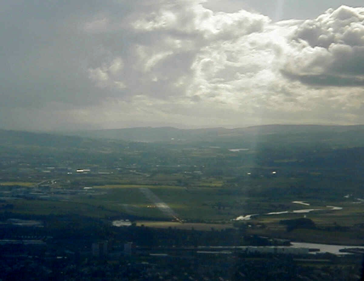 On a summer's evening this approach was over the Campsies to land on Runway 23. The sun shining through the clouds casts a pool of light on the main runway just north of the crossing with Runway 10/28.