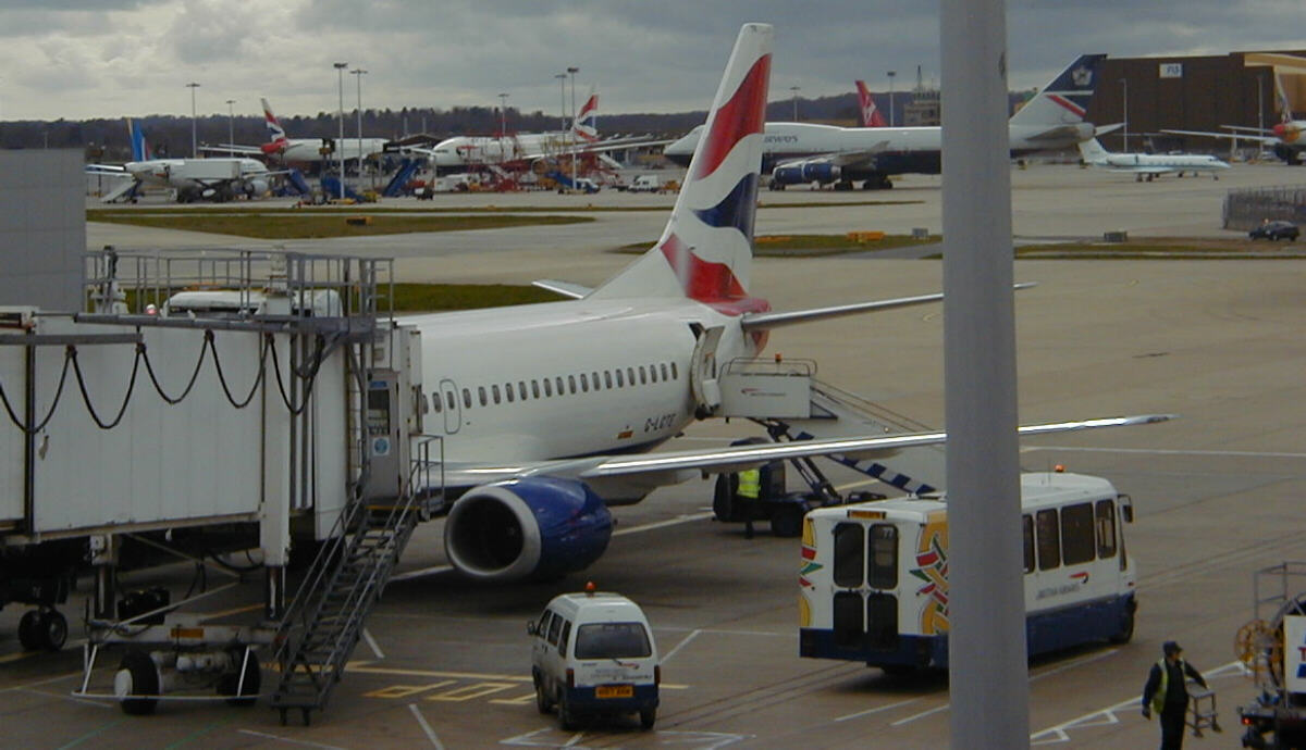 Having parked on stand 554, G-LGTE is mostly hidden behind the airbridge and a lighting column. |